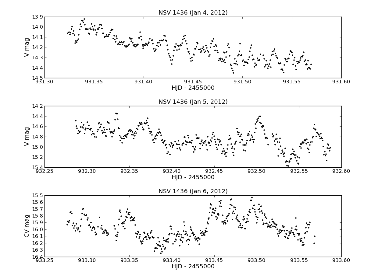 joe -------- Original Message -------- Subject: (cba:chat) NSV 1436: an interesting target Date: Sat, 7 Jan 2012 23:16:42 +0100 From: Enrique de Miguel <edmiguel63@xxxxxxxxx> Reply-To: cba-chat@xxxxxxxxxxx To: cba-chat@xxxxxxxxxxx Hi all, I would like to call your attention on this target (NSV 1436, at 04:02:39.02 +42:50:46.0). I think we have a good chance now to unveil some of the mysteries hidden by this system. Some background .... A bright outburst was registered (E. Muyllaert) by the end of March 2011. We managed to get some time series, but the target was not particularly well placed and it was dropped from our target list, as it didn't seem to show any interesting feature at the time, appart from low-amplitude oscillations. Tom also reported a single time series on Oct 12, but the light curve was equally dull (maybe we have further data in the CBA archive, but I haven't checked). Further information about this interesting target can be found in the AAVSO Alert Notice 434, reported by Matthew Templeton on March 30, 2011. From that note, one can learn that the only bright outburst of this system was around 1948 (some other less bright outbursts seem to have occurred since). This is a known X-ray source, and a recent paper (Brown et al., 2010, JAAVSO 38, 176) points to the possibility of NSV 1436 being a recurrent nova (further historical details in that paper). Basically, it looks like we don't know what type of DN this is. Tom reported last January 2 through the cba-chat that Mike Linnolt had just registered a new bright outburst (visually, at 12.4V). We started inmediate follow-up of this target (Tom, Shawn, and myself). The first 3 nights were a bit dissapointing: one could guess the presence of high-frequency oscillations, but difficult to tell about their stability. These oscillations were of low amplitude (0.03-0.05 mag) on top of rapidly decay trend of about 0.8-0.9 per day: apparently, as dull as the light curves we registered some months ago. However, the system entered on January 5 into an interesting state, with very large oscillations (full amplitude of ~0.8 mag). Some plots are shown below. From the data we have collected so far (Tom, Shawn, and myself) it seems that we can unveil the orbital period of the system, which is 0.189(3) d. On top of the nightly light curves, one can easily observe high-frequency oscillations. From the limited data we have collected so far, the main oscillations occurs with a periodicity of 0.02305(7) d. Besides this ~33 min oscillations, there seems to be others (tentatively, at 43.7 min, 22.6 min, and 13.9 min). Needless to say that all this is very preliminary and can (surely, it will) change over the next days. For those interested in following this target, I would suggest only long runs (if possible, covering over one cycle), which is feasible for Norther latitudes. The target is at the moment of writing oscillating between 15.8 and 16.5 CV, I'm using GSC 2885-1928 as comp star. Hope someone else can join the action. Enrique